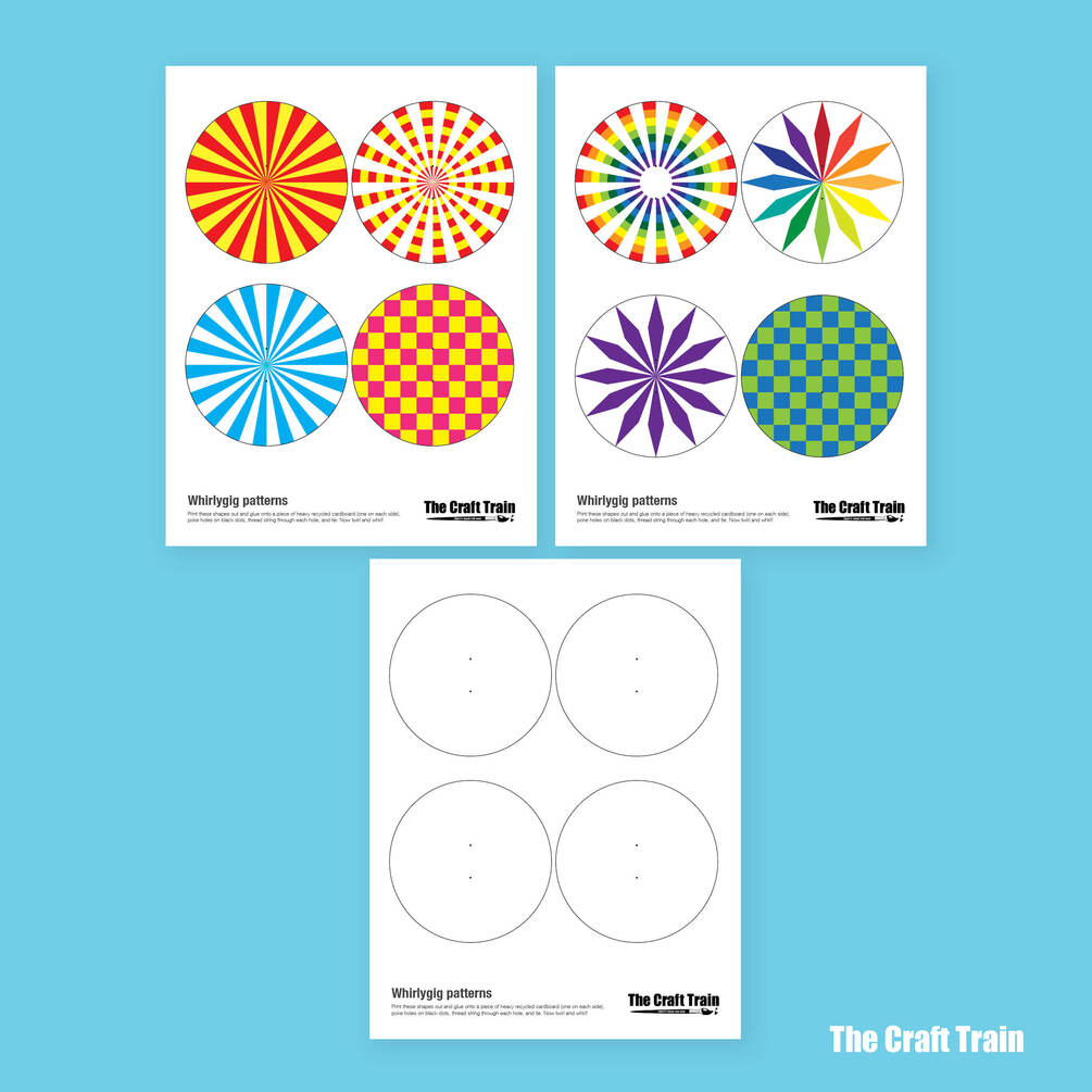 Create twirling, whirling whirlygigs using this set of printable patterns. The set includes two pages of full-colour patterns and a blank template so kids can design their own whirlygig.